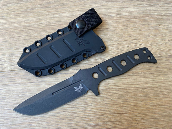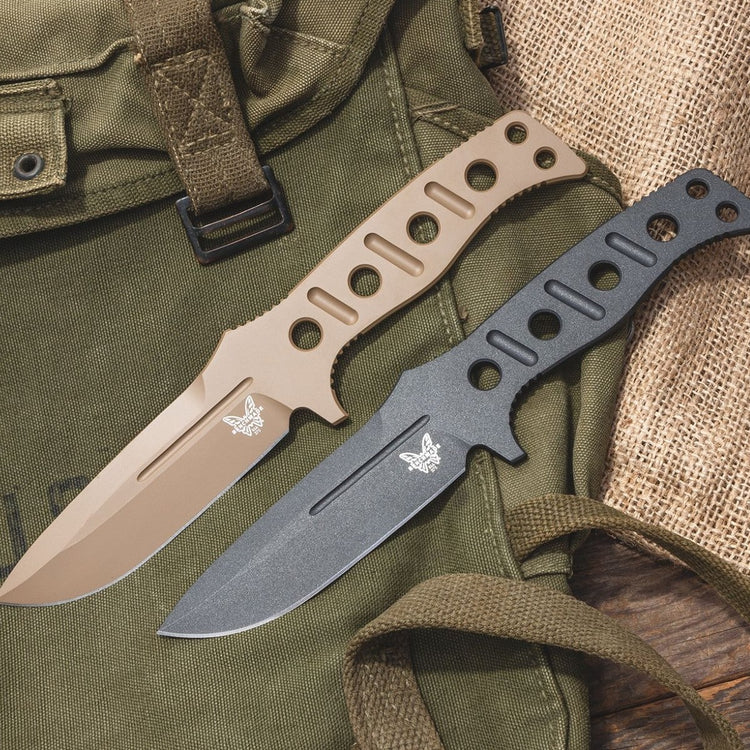 This Fixed Adamas fixed blade combat knife was designed by Shane Sibert. The tan finished CPM-CruWear drop point blade has a plain cutting edge and jimping on the spine. The handle is skeletonized with optimally positioned grooves. The Fixed Adamas knife also comes with ablackmolded sheath with secondary locking strap and tension screw for secure storage and custom tuned deployment.