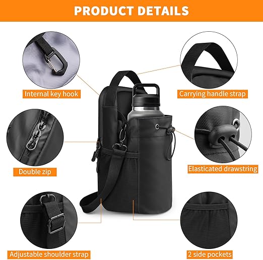 Large Capacity This magnetic water bottle bag has five separate compartments to organize your stuff. One large compartment for your water bottle, one zipper pocket with compartments and two side mesh pockets for your cell phone, wallet, keys, headphones and water bottle make it easy for you to carry your belongings.