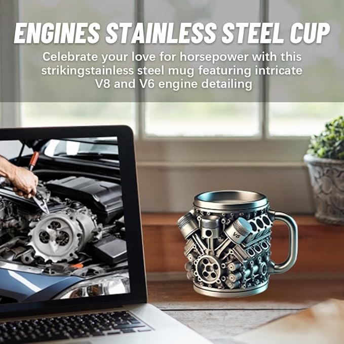 Introducing the ultimate stainless steel coffee cupfor automotive enthusiasts! Designed with an intricate V8 and V6 engine structure, this car coffee cup is a standout piece for anyone who loves cars and mechanical designs.